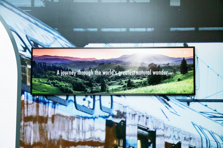 客製化 TARTAN 顯示技術(shù) 高效使用車廂空間 德鐵未來(lái)概念列車中採(cǎi)用達(dá)擎 28.6 吋 TARTAN 長(zhǎng)條型面板 ,特殊的加長(zhǎng)比例可同時(shí)呈現(xiàn)動(dòng)態(tài)即時(shí)的行車資訊及廣告宣傳。因應(yīng)以乘客需求為中心及便於辦公 、攜帶自行車等彈性空間配置,TARTAN 客製化的各種尺寸不受空間限制 ,除了可安裝於車廂狹長(zhǎng)畸零部位 ,亦能針對(duì)不同列車車型提供多樣化選擇。